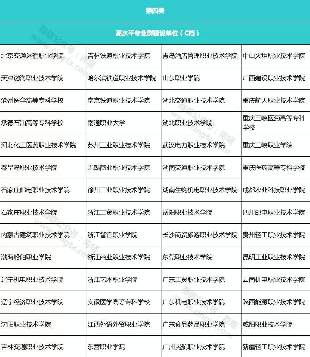 據悉,入圍“雙高計劃”的高職院校分為四類,其中類包括:高水平學校建設單位(A檔)10所;第二類包括:高水平學校建設單位(B檔)20所;第三類包括:高水平學校建設單位(C檔)26所、高水平專業群建設單位(A檔)26所、高水平專業群建設單位(B檔)59所;第四類包括高水平專業群建設單位(C檔)56所。